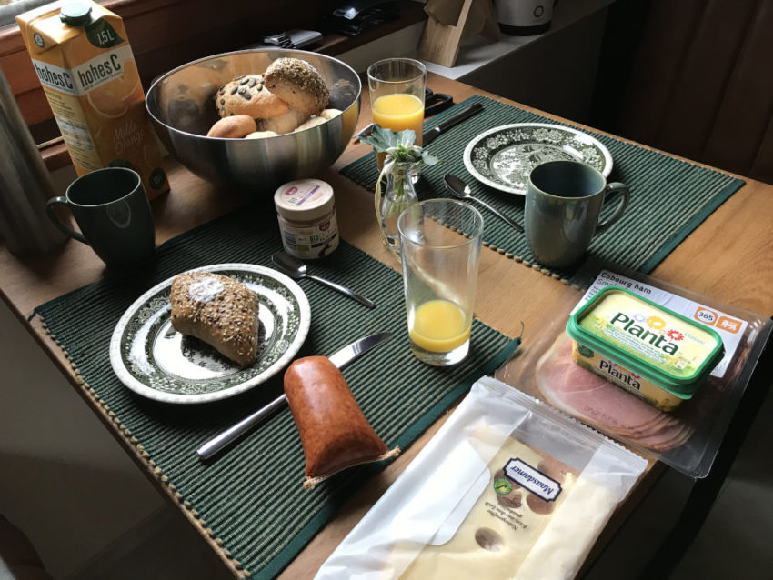Am nächsten Tag beim Frühstück, suchen wir uns mögliche Wanderwege heraus. Vor allem soll er an möglichst vielen Felsformationen entlang gehen, was Teile des Mullerthal Trails bieten. Erschwerend kommt leider ein Problem dazu: ich fühle mich krank und hatte es schon schwer, überhaupt aus dem Bett zu kommen. Wie lang ich heute also wandern kann steht in den Sternen und bedeutet, dass wir unterwegs möglichst flexibel sein sollten, um notfalls abbrechen zu können. Dennoch sind wir guter Dinge.
