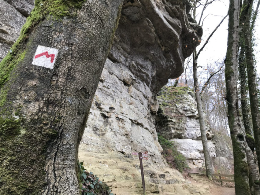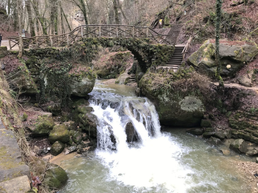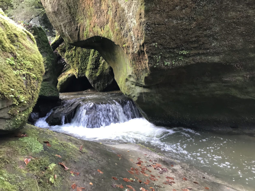 Wir parken ganz in der Nähe des berühmten Schiessentümpels und folgen von hier der Route 3 des Mullerthal Trails, also immer dem rotem M auf weißem Grund. Eine riesige Felswand führt den Pfad auf dem wir wandern, vorbei an mehreren Wasserfällen und verträumten Brücken. In Mullerthal selbst nehmen wir, mehr versehentlich, die Umleitung und landen prompt auf der Route 2 des Mullerthal Trails. Doch das stört zum Glück nicht weiter. Dass ich den Tipp mit der Taschenlampe vor ein paar Tagen ernst meinte, findet mein Begleiter in der Räuberhöhle heraus: Auf der steilen Leiter geht es runter in einen tiefen dunklen Schlund, der uns nach wenigen Metern und durch einen schmalen Felsspalt wieder ins Draußen führt. Und immer wieder kommen wir nah an meterhohe Wände, durch die man sich mal mehr, mal weniger durchzwängen muss. Besonders schön ist es am Predigtstuhl: der Weg allein dorthin ist schon atemberaubend, doch als wir dazu den Weg durch das Binzeltschlüff entdecken, werden die Augen immer größer. Ein Abenteuerspielplatz – nicht nur für Kinder! Rund 14 km und bis zum Schloss Beaufort wandern wir, bis mir die Energie ausgeht. Die Erkältung zwingt uns nun doch zum Abbruch und ich schleife mich bis zur Bushaltestelle in Beaufort. Ein Glück: der letzte Bus fährt in 30 Minuten und fast bis vor die Haustür nach Eppeldorf. Durchgefrohen aber glücklich, beziehen wir am frühen Abend wieder unser Ferienhaus in der Natur und überlegen schon für morgen, welchen Wanderweg wir nehmen wollen.