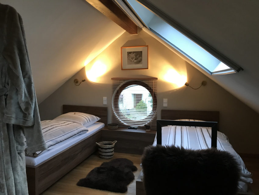 Das sehr kleine, gemütliche Dorf liegt wirklich herrlich abseits von allem Trubel. Vogelgezwitscher und Windrauschen sind das einzige, was man hier hört. Ich komme zuerst an und werde herzlich empfangen. Meine Gastgeber führen mich in ihrem Häuschen herum, das früher mal ein Musikraum für den Herr des Hauses war – davon ist heute nichts mehr zu sehen. Stattdessen: zwei Stockwerke hat das Ferienhaus, eine nagelneue Küche, ein stilvoll gestaltetes Bad und in der oberen Ebene gibt es einen geräumigen Wohn- und Schlafbereich mit unseren Betten. Die stehen direkt unter der Dachschräge was mit den schweren Holzbalken im Raum und den erdigen Farben, zusätzlich zur Gemütlichkeit beiträgt.
